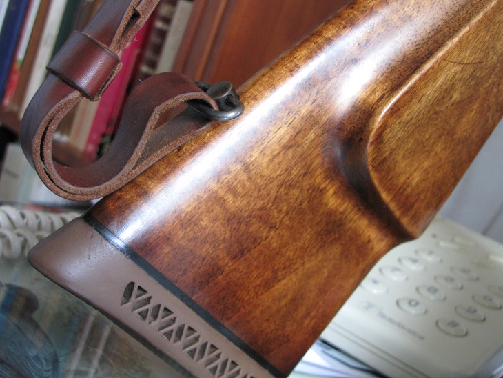 A este sí le dí quitabarnices, le raspé los restos, y usé el Tru.Oil. Tiene unas diez capas, y ha recorrido España aguantando aguas y soles.Mantuve la cantonera original porque lleva la marca Sako, pero seguro que ese rifle me hubiera quedado mejor con la Holland de la Grulla.