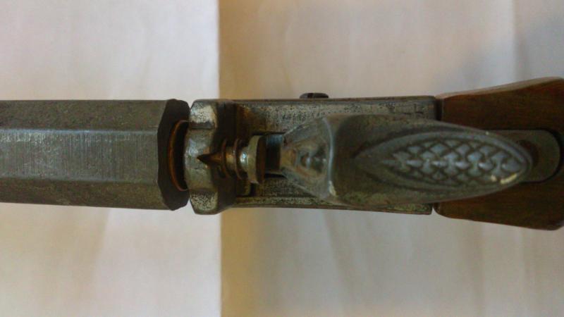 En la primera foto se aprecia que el martillo golpearia en un percutor, aguja percutora, que tiene un muelle. En la segunda foto se aprecia que la cola del martillo se fabrico de fundicion en molde, en el centro se aprecia donde estaria la union del molde. La patina del metal no se corresponde con un arma del siglo XIX. Por todo lo anterior, yo creo que es una copia moderna de una pistola de salon.
