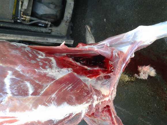 Hombre, esa fue la herida, si es verdad que la sangre puede faltar porque uno de los perros de la rehala estuvo rondando y puede que la lamiera, pero no se, ese fue el resultado que encontré tras el disparo (2h después)