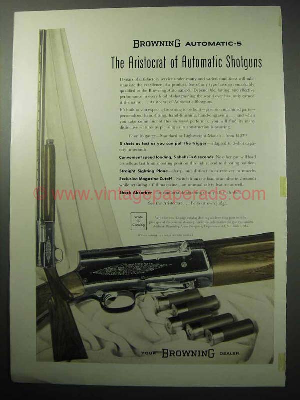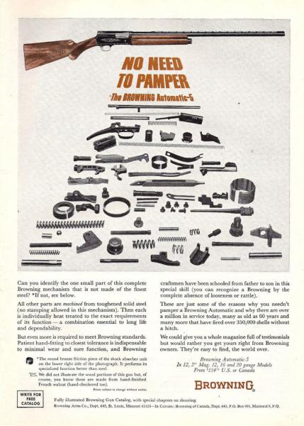 Tienes que pensar que la Auto-5 se la denomino durante muchos años como la “The Aristocrat of Automatic Shotguns” o sea la aristócrata de las escopetas automáticas, esta denominación no es solo una campaña publicitaria, es una realidad ya que por mediación del departamento Custom Shop podías hacer tu pedido de la Auto-5 totalmente personalizada e única como si se tratara de una superpuesta B-25 o una yuxtapuesta del tipo Anson denominadas como Side-by-Side.