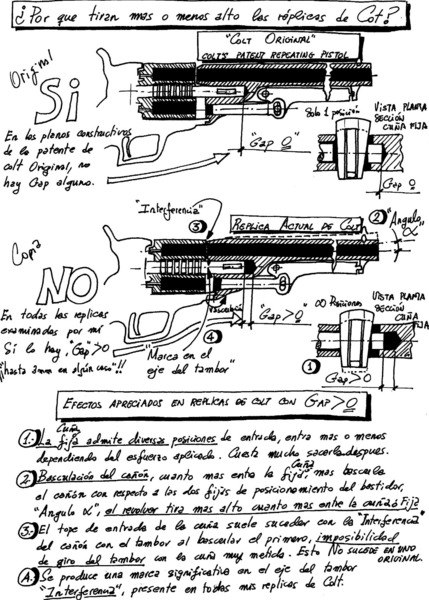 Tras un análisis del sistema de unión entre el bastidor principal y el cañón he identificado un fallo en mis armas replicas de Colt de Pietta y Euroarms + Uberti de un compañero, este defecto inadmisible que tras la revisión de los planos constructivos de la patente de Colt es exclusivo de nuestras replicas actuales, excluye estas de ser utilizadas eficientemente para la practica del tiro de precisión. Si Samuel Colt levantara la cabeza nos corria a gorrazos.