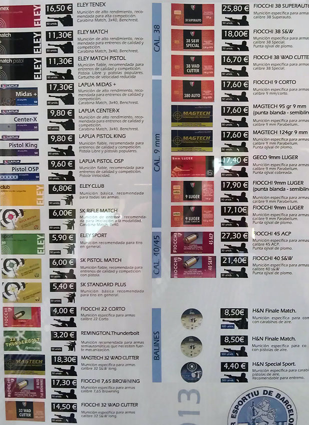 La cuota de entrada son 100 €, pero te incluyen el primer trimestre. Sobre el precio de la munición nada mejor que una foto que saqué hace un tiempo (la columna de la izquierda son .22LR menos las 3 últimas que son .32):