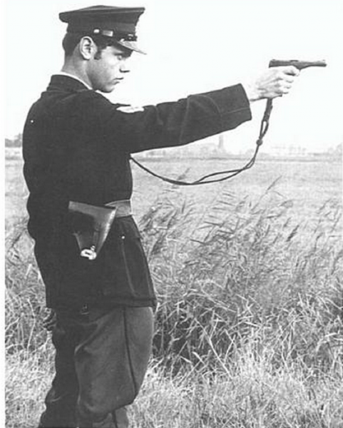 El oficial en primer término me atrevo a decir que puede llevar una pistola Husqvarna m/1940 copia de la Lahti finlandesa.