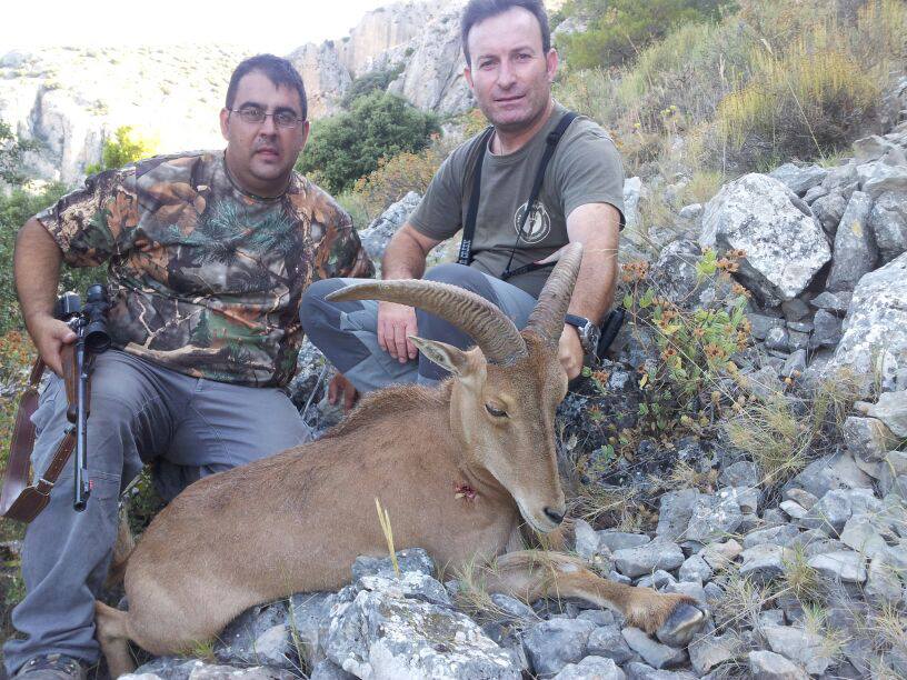 A las 6 de la mañana ya estamos es Alcoleja y a las 6 y media llega nuestro anfitrión y guía, no hay tiempo que perder cogemos los trastes y a la carga ya que según comenta es primordial localizar los arruis pronto ya que si no una vez se echan con la calor no hay forma de verlos, comenzamos pues la localización y sobre las 7 y media damos con una pelota de unos 14 ejemplares que se encuentran en unas carrascas, sacamos los bártulos y comenzamos a acercarnos a los arruis, la caminata es imponente después de dos horas siguen en el mismo sitio y nosotros casi también, es un terreno infernal de piedra suelta y aliagas, sobre las 10 y media llegamos a un saliente y los arruis han desaparecido, parece increíble, llámanos por la emisora a los observadores que se han quedado mirándolos para informarnos si pasaba algo y nos dicen que están allí, pero nosotros seguimos sin verlos, así que por la hora y por la distancia tenemos que tomar una decisión rápida y esta no es otra que ascender por una pared infernal lo mas rápido que podamos antes de que se tumben y los perdamos del todo, después de una subida penosa llegamos a otro saliente y localizamos los arruis, preparamos el puesto y seleccionamos uno, el situado mas a la derecha del grupo es el elegido, medimos la distancia y esta situado a 312 metros, nuestro guía me dice que lo si lo quiero intentar ya que no tendré otra oportunidad hasta la tarde por que el sol aprieta y se han a echar, decido intentarlo, tengo mucha confianza en el arma la tengo puesta a tiro a conciencia y en su calibre (un 30.06 por cierto
