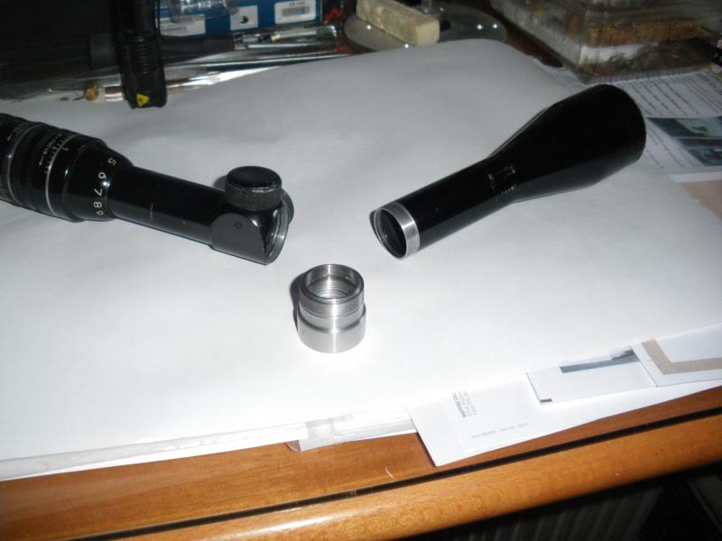 2º construí el casquillo que las unes y que en su interior tiene dos roscas diferentes, en una el tubo y en la otra el casquillo que porta la lupa.