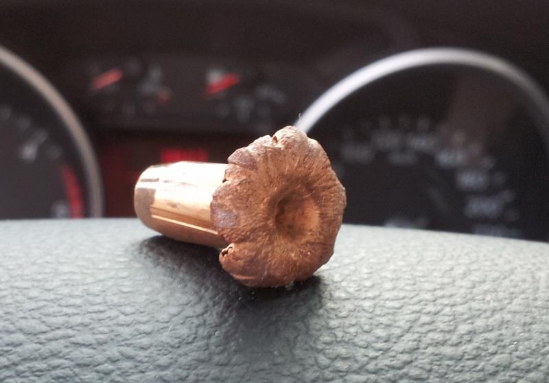 hornady GMX de 165grain, 308w tirada a un cochino a 180metros le entro por el jamon delantero izquierdo y se quedo alojado en el jamon trasero derecho. no encuento la foto del guarro pero pongo la del proyectil, quedo fulminado.
