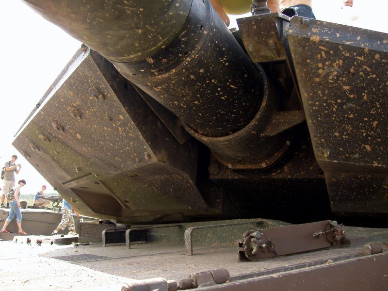 Cuando un fabricante de blindados se da cuenta de un punto débil en su diseño intenta paliarlo de alguna manera. En el caso del Leopard 2 vemos en esta foto que pusieron una cincha de acero que va desde la escotilla del conductor hasta el mismo borde de la barcaza, justo por donde bordea la torre (se ve perfectamente en esta foto); y, por detrás, le hicieron el bisel que tiene la cubierta del motor, que hace que el ángulo de incidencia para llegar al anillo sea bastante superior a la horizontal; y, si algún proyectil coge ese ángulo, se estrella contra la cubierta del motor (más blindada), no en el anillo.