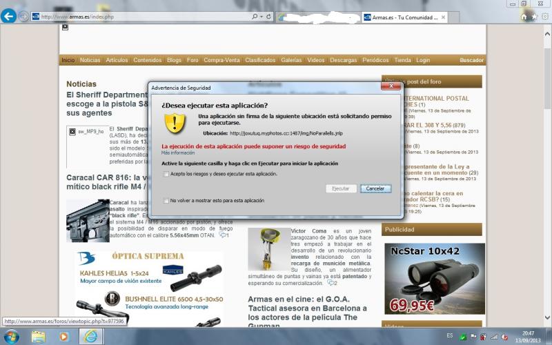 a mi me a saltado dos veces el antivirus al intentar entrar en la pagina principal al abrir armas.es me salta el antivirus y el java me pide permiso para cambios en el ordenador ,