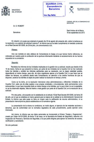 Bueno pues hoy me ha llegado una carta certificada donde me contestan desde la comandancia de Barcelona.