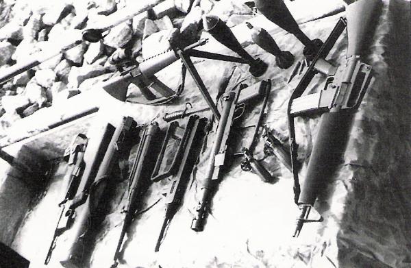 de izquierda a dercha , una pistola tipo mauser , un lanzacohetes LAW M72 , , un subfusil MP-40 , un subfusil Madsen M-50 ( por el alza plana fija ) , un subfusil Sueco Carl Gustav M-45 , muy usado por los SEAL , dos revolveres con el tambor abierto