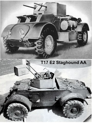 El T-17 "Deerhound" llamado Staghound por los ingleses con una tripulación de 5 hombres y con un armamento de 1 cañón de 37 mm, 1 ametralladora coaxial de 7,62 mm., y otra de igual calibre y 1 del 12,70 mm., fue el mas pesado de todos los auto ametralladoras diseñado en USA, pero que no fue utilizado por el ejercito por el tamaño. Los 200 y pico vehículos fabricados se desarmaron y fueron usados por la MIlitary Police USA en el continente en unidades de reserva y seguridad de prisioneros. Los ingleses si lo usaron en cantidad - unos 2.700 +/-, en África y Europa, pero en Europa les dio problemas por el tamaño.