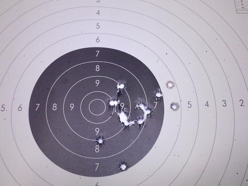 Finalmente no he podido ir al campo de tiro hasta hoy y no podía haber empezado mejor con cuatro dieces seguidos. En el blanco hay quince disparos y de los nueves solo he identificado antes de mirar el blanco justo el último disparo que se me ha quedado bajo.