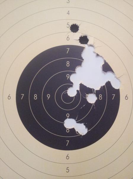 Tambien hay que decir que no estaba disparando para hacer una buena agrupacion, el tiro se realizo de pie, sin apoyo, y disparando tiros rapidos hasta vaciar el tubo. Seguramente con apoyo y tirando con calma a 25m podrias meter una bala dentro del mismo agujero de la anterior, y a 50m hacer una agrupacion muy muy decente. (Dispare con el docter combat sight, que como se puede apreciar esta desviado a la derecha)