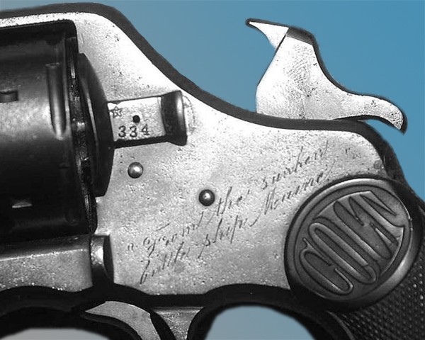 El revólver Colt 1889, 1892 ó 1895 (yo no los distingo) que formaba parte de la dotación del Maine, recuperado del fondo del mar 24h. después del hundimiento del acorazado.
