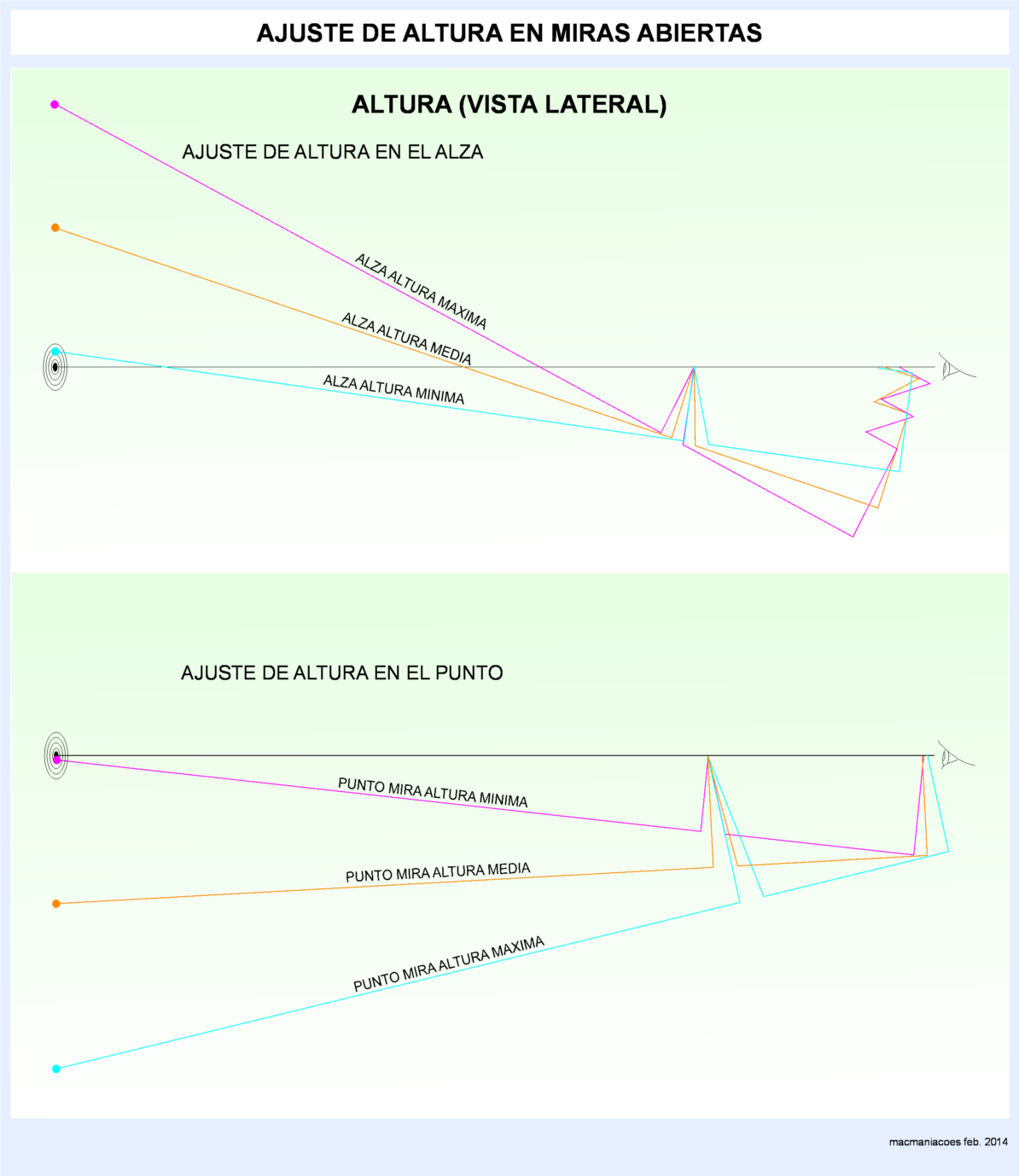 De nada, oncentfs. Pa eso estamos. Ya de paso, hoy he hecho otro gráfico añadiendo la línea de visión ojo-blanco porque me parecía que no se entendía bien por qué los ajustes se invierten dependiendo de si están delante en el poste o detras en el alza.