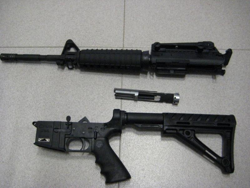 El lower, upper, asa, culata (que es fija, y cambiare por un "colapsable") y el cargador es polimero, y el cañon es acero con un acabado tirando a parkerizado, no un tubo recubierto de plastico como las walthers, el punto de mira con la toma de gases falsa, es metalico como la bocacha (atornillada y sin vaciar en las muescas)