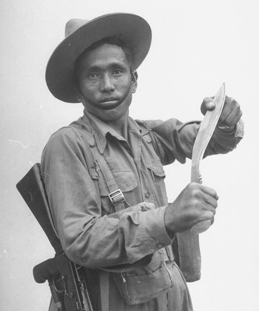 El Gurka lleva como es lógico un kukri y un sten mk4 o mk5, las otras que comparten padre son una daga F-S y un Smatchet, de William Ewart Fairbairn, un pionero de las tecnicas de tiro y combate cuerpo a cuerpo, ya se ha hablado aqui de su trabajo.