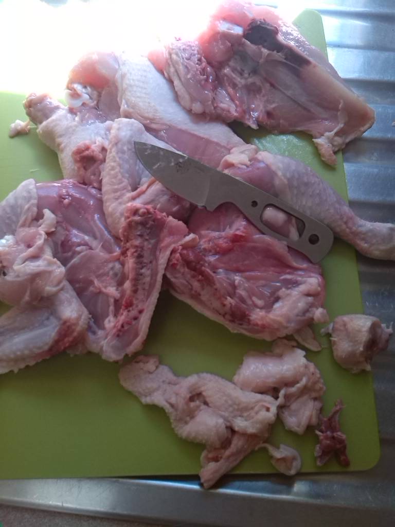 El corte del pollo es limpio forzando por mi parte en algunas ocasiones a cortar por hueso/rotula para ver que el filo sea duradero. Su filo no es necesario retocarlo, por el momento.