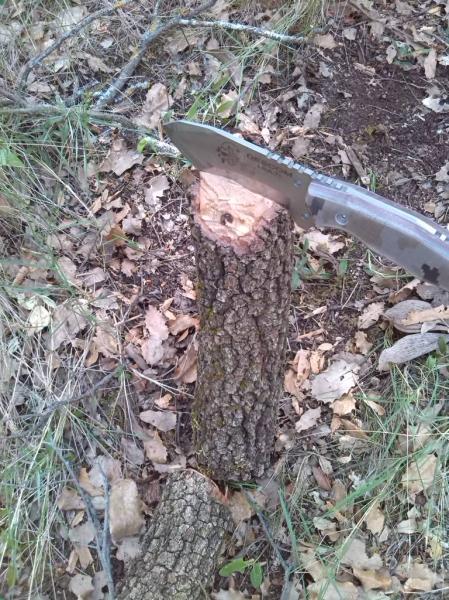 Para ello, aprovechando que había un roble que se había talado con anterioridad y aunque la posición inicial de trabajo era algo incómoda por no poder girar a mi gusto el tronco al machetear me puse a la tarea. El grosor que tomé para la prueba daba la impresión en un principio de ser una tarea dura para solo 12cm de longitud de hoja pero no solo no decepciono sino que me entusiasmó como fue pasando el macheteo, el corte trasversal y el afilado fino de madera.