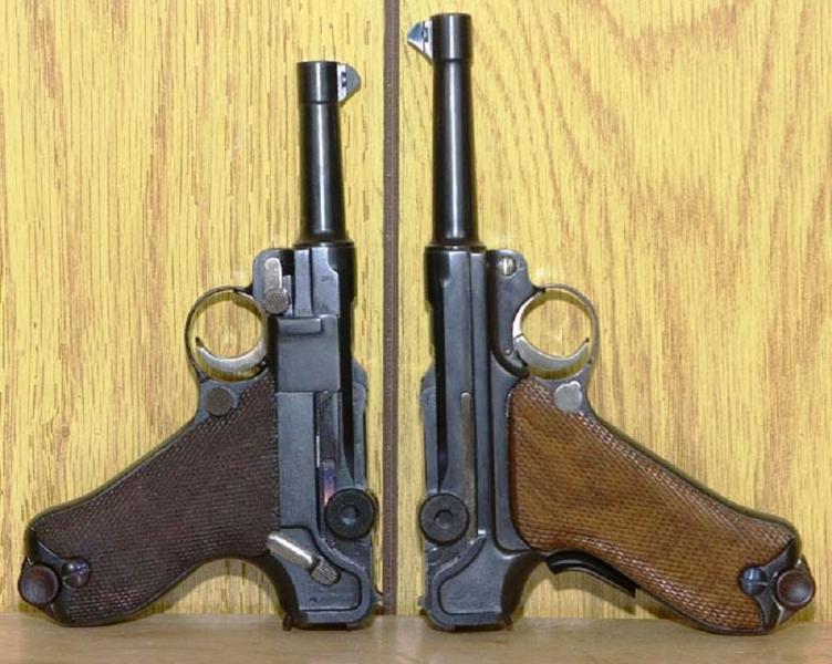 Arriba una "Baby", en medio la "Seven Shot" y debajo una de estas de 7 disparos comparada con una Luger estándar.