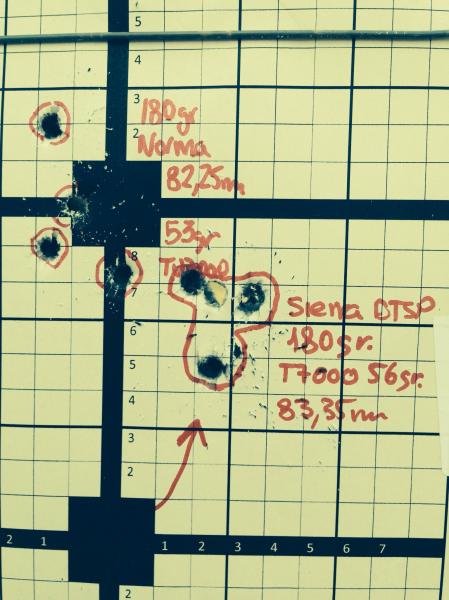 Con puntas de 180 gr tanto sierra GK o norma sp, la que mejor agrupan son tubal 5000 47 gr y la tubal 7000 56 gr. Lo que no me gusta es que la 5000 me da velocidades de 775 ms aunque la agrupación es de unos 0,6 moa. Con la 7000 da 850 ms y menos de moa.