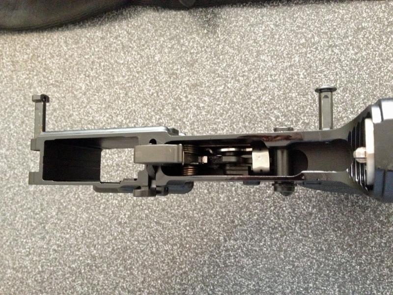 Podemos ver que el disparador es mucho más complejo que el de un AR convencional, lleva un seguro para retener el martillo y una placa para proteger la retenida. Además el diseño permite meter el seguro en cualquier posición del cierre, este el martillo montado o no.