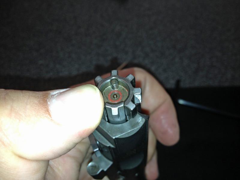 Detalle del porta cierre, se puede ver el seguro de la aguja, este es un avance muy importante ya que los ARs convencionales pueden tener un fallo llamado Slam Fire, que se produce cuando el cierre avanza y una aguja con excesiva holgura provoca un disparo accidental.