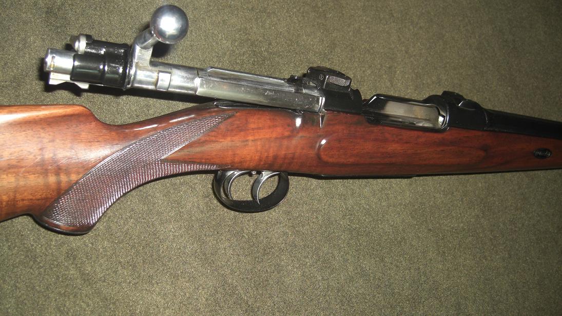 175 mts. El nombre del fabricante grabado en el nervio del cañón , fabricado en acero Krupp. La acción perfectamente acabada con punteado en la parte superior y mecanizada para instalar unas bases Schuler para óptica. La parte inferior de estilo militar cuidadosamente esculpida y el guardamonte bastante amplio. No era raro para los cazadores solicitar ésta parte inferior y el trabajo de remodelación es excelente. Actualmente descatalogado éste