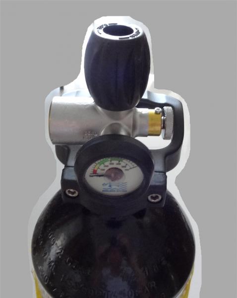 Pongo una foto del regulador de la botella en la que se aprecia la llave principal, el manómetro, el purgador y el conector DIN300 así como del adaptador al latiguillo de carga.