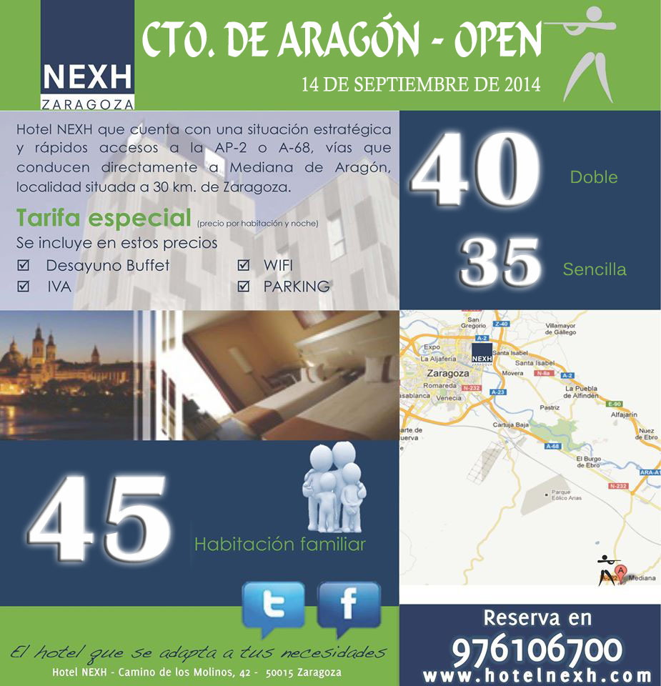 Ademas os recuerdo de la gran oferta que nos ofrece el hotel NEXH de Zaragoza,.... no olvideís decir que participaís en el Camponato al hacer la reserva.