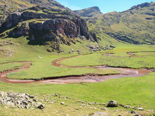 La planicie de este valle hace que el río no pueda avanzar en un curso "normal". Así que discurre trazando meandros. Es tan liso que los extremos del valle se pueden ver sin que medie ningún desnivel. Desde la entrada puedes ver perfectamente a un excursionista vestido de rojo que esté al fondo.