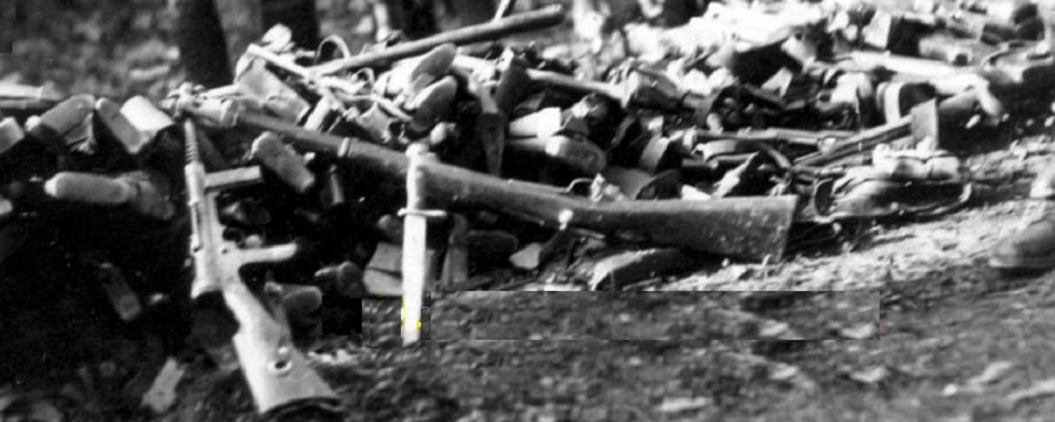 yo veo 3 subfusiles Ppsh -41 , 2 PPS -43 , una P-08 , una Radom Vis 35 ( creo apreciar el seguro de aleta en la corredera ) , una Mauser C 96 y una Walther P-38