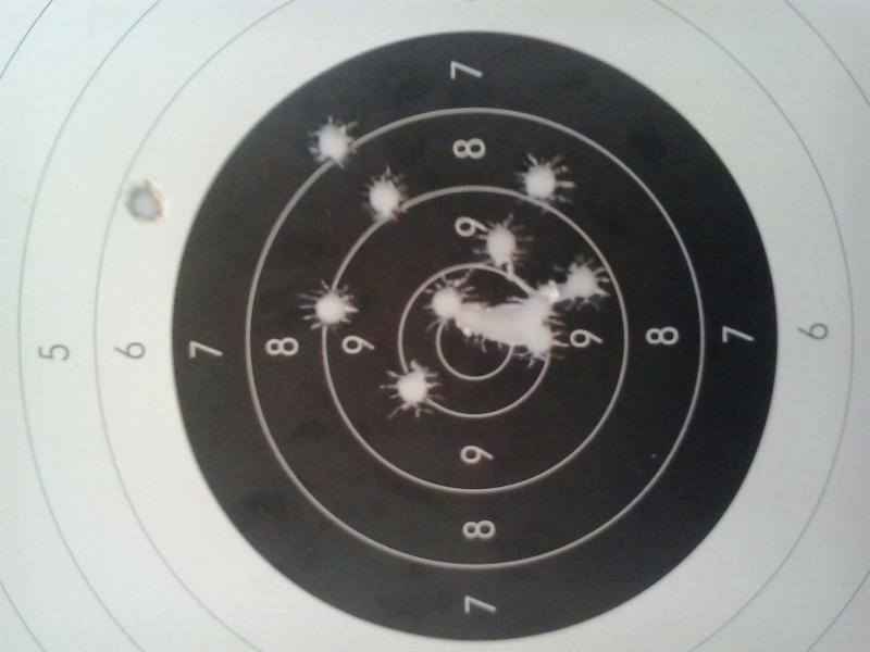 Aunque sigue habiendo tiros malos que casi con total seguridad SON FALLOS DE PUNTERÍA, tengo que insistir en estos parámetros y AFINAR más en la puntería porque como te descuides un pelín y no te concentres te haces hasta un CERO como el que se ven en el bajo del blanco.