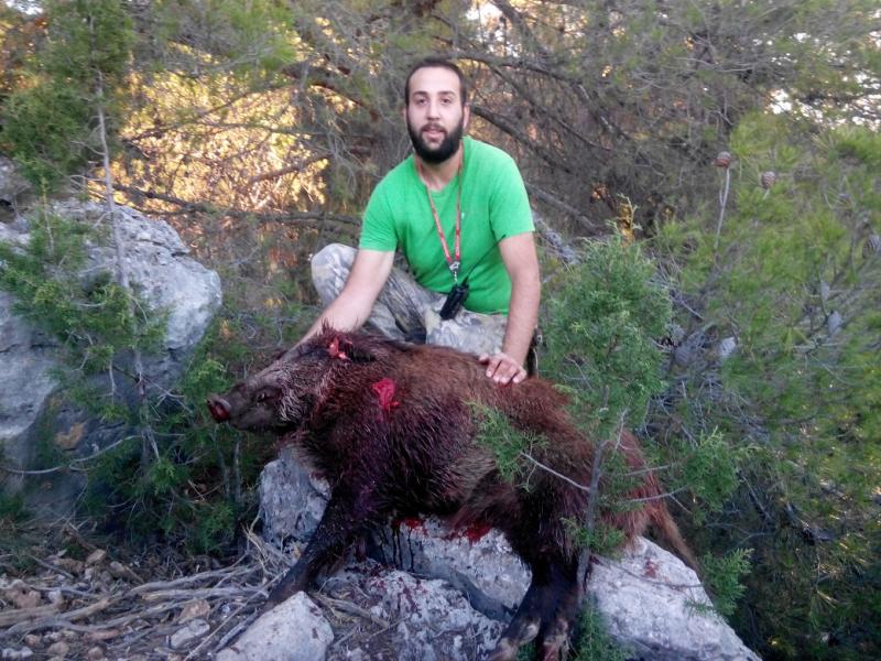 Entraron tres jabalíes y esta se paro un instante delante de mi, cuando encare el arma arranco a correr y le pude tirar a unos 25 metros mas o menos, el tiro quedo un poco retrasado y tuve que re matarlo con el cuchillo, los otros dos pasaron como rayos les tire pero nada a criar