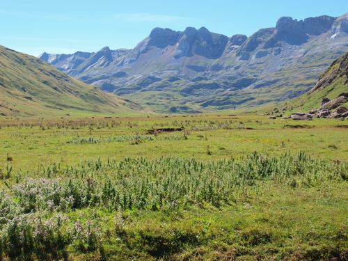A veces "trucamos" las fotos para que el paisaje aparezca más bonito, pero te aseguro que estas tienen sólo una mínima mejora del contraste. El color, las montañas, el cielo es tal cual es. El valle de Aguas Tuertas (que no Aigües Tortes, que es otro) merece una visita al menos una vez en la vida. Ahora han prolongado la pista hasta la misma puerta para facilitar el acceso a los ganaderos pero no ha perdido nada de su encanto aunque está tan accesible que no es nada raro encontrar grupos de excursionistas ingleses de edad avanzada. Supongo que para alguien de esa edad el Pirineo es más cómodo que los Alpes, más fácil de pasear y seguramente también más barato.