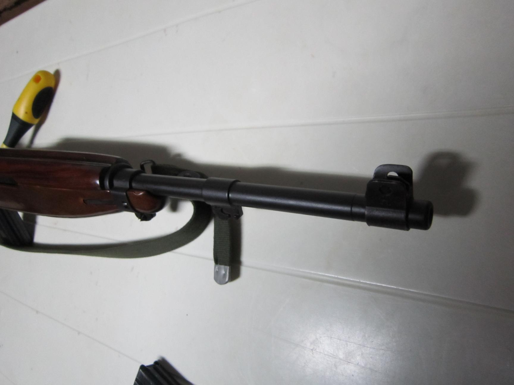 Sospecho que está fabricada por Inland,hace algún tiempo,cuando ni siquiera pensaba en venderla identifiqué el marcaje,tiene un número de serie bajo: 06xxx ,la mira trasera es la típica ortóptica de regulacion en altura y deriva,creo que hay otra de dos posiciones cerrada,en otras carabinas,al estilo de los fusiles Enfield,la palanca de montar,si te refieres a que va ranurada,la única explicación que puedo dar,sin ser un experto, es que al tratarse de las primeras "hornadas" de esta carabina,se fabricó en época de paz,cuando los USA no habían entrado en guerra,ó sea antes del ataque a Pearl Harbor,y tiene este arma un acabado mas logrado,y no fabricada en época de guerra,a toda pastilla,desconozco si el enganche de la bayoneta es único,ó si hubieron varios modelos.
