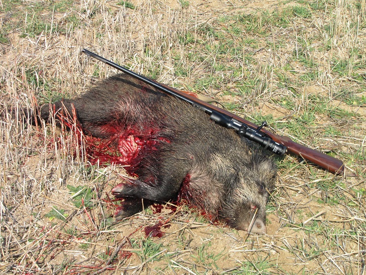Creo que ya os puse este macho, que llevaba un blindaje de barro de cinco centimetros, y que a poco me quita de enmedio. Le di dos tiros , el primero en el culo, y el segundo en la paletilla izquierda, a cinco y treinta metros repectivamente. Soltó una polvareda terrible. Y se quedó seco. La bala era la misma, 150 gr. CL de remington. esa mañana casi desintegré el de la foto que tiene fuera los intestinos ( ¿ Se precisa que sea un marranete de los que no debia ni haber tirado para que tenga esos efectos?.......