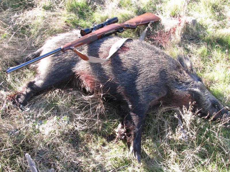 Y ahora dos ejemplos de que el mejor rifle no vale para mucho si haces el boceras, y que un simple 270 deja frito a cualquier gorrino si lo das donde debes. El guarro grande, de la espuma de pulmon en la boca, me entró a doce pasos cuando venia de pistear otro que herí y creia muerto. Le tiré cuatro tiros, animalito, de frente el primero, que le rozó la mejilla y le tronchó la pata. Y otros tres mas, todos sucios mas o menos, de atras adelante. No tenia mas balas (ese dia tire entera la caja que llevaba) y tuve que esperar a que agonizara el pobre bicho. Una chapuza enorme. Era el 308. Con un anticarro hubiera sido igual.