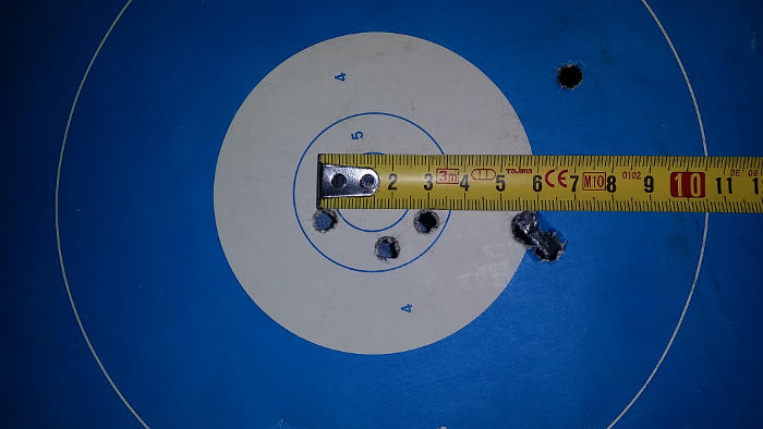El primer disparo impacta a la izquieda unos 12cm alto ( entre el 8 y el 9).