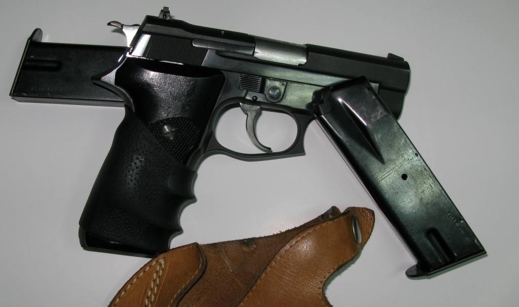 Cal. 9 parabellum. 15 cartuchos, doble acción, desamartillado., copia Española de Sig Sauer.