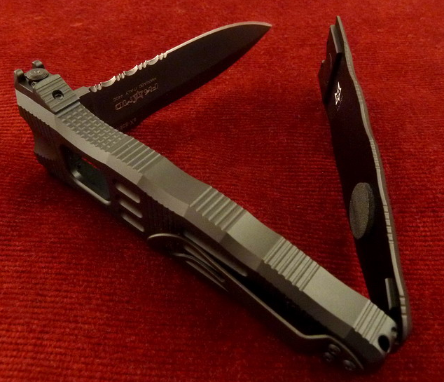 EMPUÑADURA DE ALUMINIO ANODIZADO, CON CLIP DE ENGANCHE ( acero inoxidable 420J2B ), Y HUECO PARA COLOCAR CORDON FIADOR. SISTEMA DE APERTURA Y CIERRE "DOBOLOCK" CON BLOQUEO DE LA HOJA.