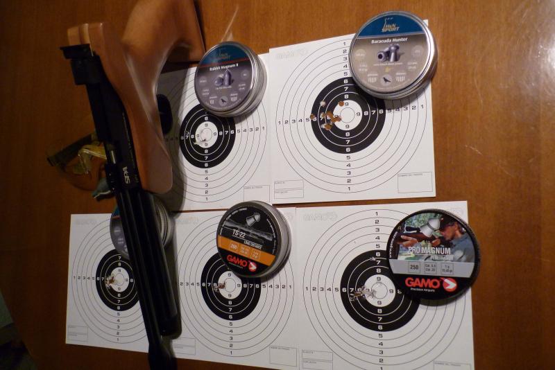 En cuanto a precisión, os dejo unas dianas con distintos balines, (lo siento, no tenia JSB aquí en casa, en otra ocasión lo haré), pero los resultados han sido buenos, he de decir que la distancia es 10 metros, a mano alzada y con el arma según ha salido de la caja, sin ajustar miras ni nada y yo que no soy tirador profesional.