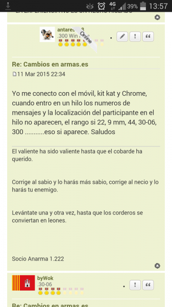Yo me conecto con el móvil, kit kat y Chrome, cuando entro en un hilo los numeros de mensajes y la localización del participante en el hilo no aparecen, el rango si 22, 9 mm, 44, 30-06, 300 ...........eso si aparece. Saludos
