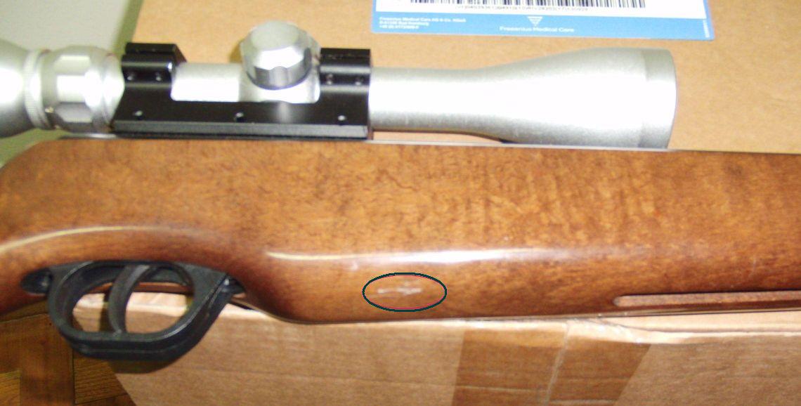 La carabina funciona perfectamente, con un buen gatillo de dos tiempos bien definidos, tiene una pequeña mancha de óxido en el exterior del cañón y una ralladura en la madera, pongo fotos de todo ello, señaladas con un círculo.
