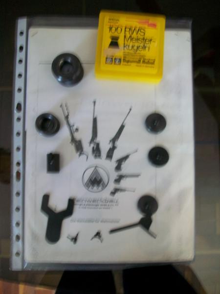 con sistema de tiro en seco, 3 bombonas de CO2, 3 contrapesos, adaptadores de carga y vaciado, un punto de mira, otros varios repuestos y llave herramienta, todo original, instrucciones y maletín de madera hecho a medida. Estado mecánico y estético impecable. Se puede ver y probar en Madrid. 350 Euros mas gastos de envio.