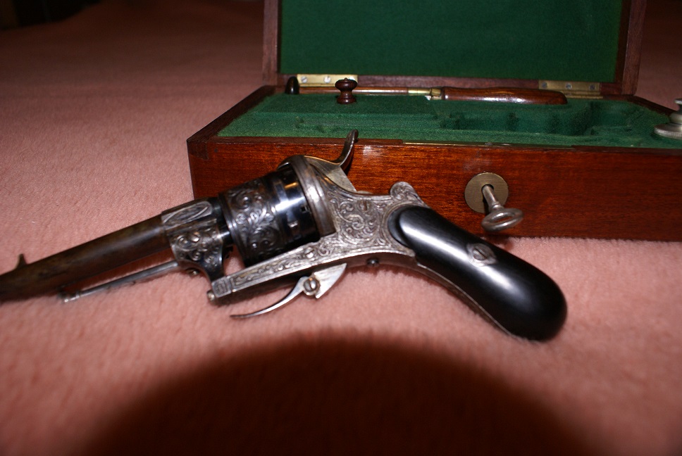 Es un trabajado revólver Lefaucheux fabricado casi con toda seguridad en Bélgica.