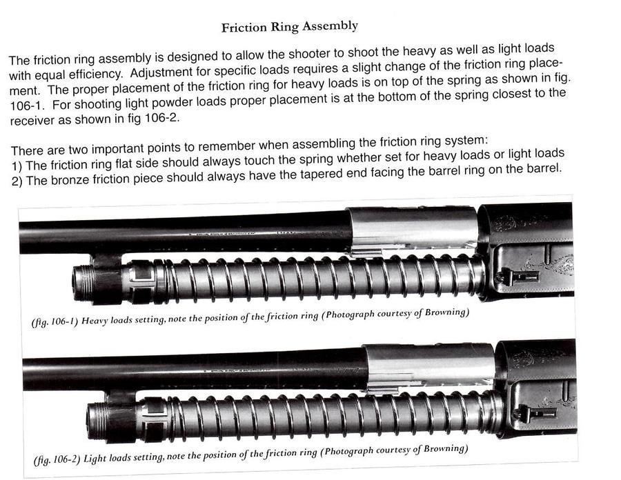 Sinceramente Josep, no veo yo que por estar la parte cóncava del anillo cónico contra la primera espira del muelle vaya a rallar el tubo del depósito por fricción o vaya a haber cualquier desperfecto. Lo que si que he visto es que el anillo cóncavo sobre el muelle lo pongamos con la parte cónica hacia arriba o abajo tiene un ligero ladeo debido a la configuración de éste. Piensa que si se pudiera rallar, cuando el sistema lo tenemos para cargas fuertes que ahí sí se produce una presión del anillo de bronce con el anillo cónico para generar la retención del retroceso se podría rallar también y sin embargo no lo hace. Por otro lado y después de hacer las pruebas pertinentes en mi Auto 5 también he tenido en cuenta si a la hora de presionar el cañón contra el muelle y teniendo el anillo cónico de las dos maneras lo que podría pasar, por ejemplo si por estar el anillo cónico hacia abajo se pudiera incrustar éste en el muelle, bien por el diametro interior o exterior y lo que he visto es que se queda a ras y no experimenta ningún cambio. Dicho esto, que nadie piense que yo quiera contradecir las enseñanzas de nuestro Gran Inventor John Moses o que quiera inventar algo nuevo sobre un sistema archiprobado pero pensándolo un poco me parece que esta forma de hacerlo podría ser tan válida como la del manual y con ella nos ahorraríamos tener que sacar el muelle que normalmente todos tenemos untado con grasa con lo desagradable que es (por lo menos para mi).