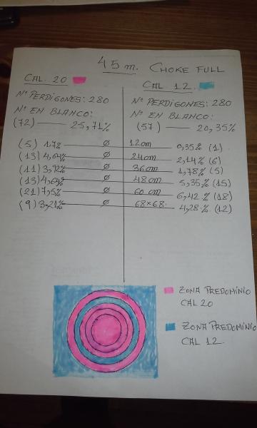 me queda pendiente otra prueba, que me parece importante, es la de penetracion. Intentare hacerla sobre listines telefonicos. lamentablemente en varias de las dianas ha habido algunos perdigones que han marcado pero no traspasado. Con los dos calibres muy parecido. Lo preocupante es que ha sido incluso en la distancia de 8m. Oscilan entre un 1% a 2%,. con esa prueba podria descartarse si esto se debe a los chokes o a la calidad de los cartuchos o aun peor a la de la polvora. Hablando con un compañero de foro que conoce bien el tema, parece que las polvoras que usamos en España distan mucho de ser lo que nos venden. su mejor cualidad es que son baratas.