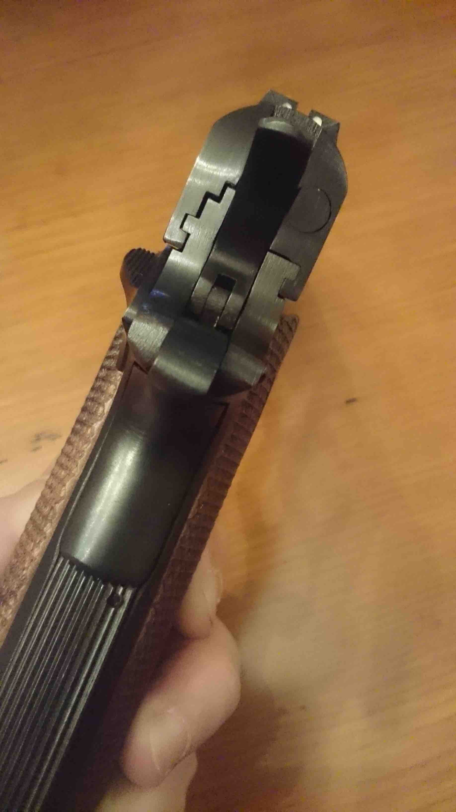 Tiene guía larga de muelle recuperador, muelle del fiador más ligero ,muelle principal a 19 libras y cachas de plástico de servicio. Me faltaría parkerizarla y ya sería para mi perfecta :lol