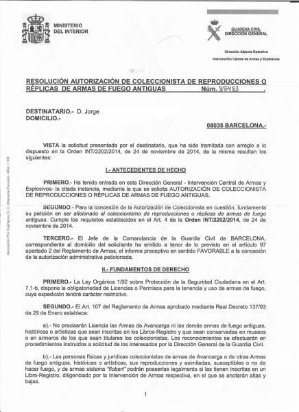Al hilo del tema... Esta mañana el cartero me ha traído un certificado y.. Bingo! La autorización de coleccionista de reproducciones o réplicas de armas de fuego antiguas, que reproduzco a continuación: